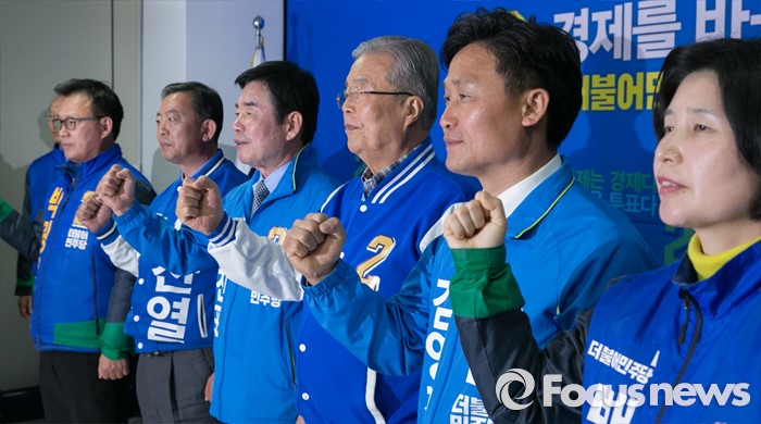 (수원=포커스뉴스) 20대 총선을 이틀 앞둔 11일 오전 수원 장안구 더불어민주당 경기도당 회의실에서 김종인 비대위 대표 겸 선대위원장이 수원 후보들과 대국민 성명 발표를 마친 뒤 구호를 외치고 있다. 왼쪽부터 박광온 수원정, 이찬열 수원갑, 김진표 수원무 후보, 김 대표, , 김영진 수원병, 백혜련 수원을 후보.