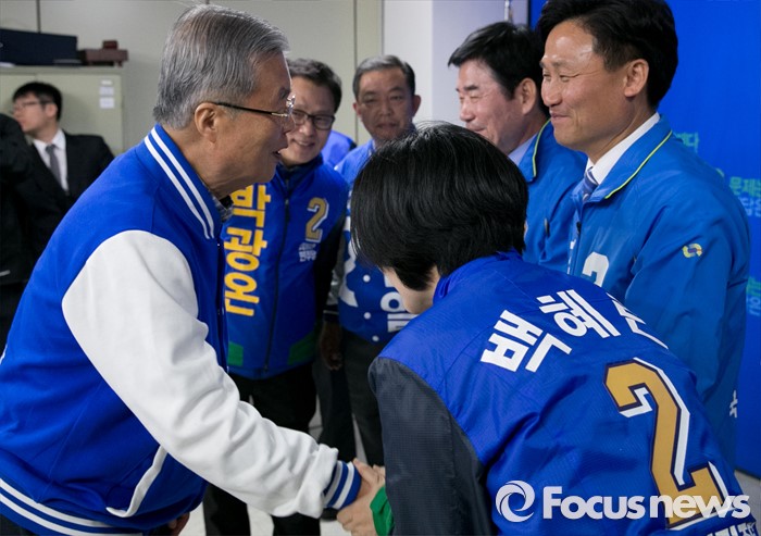 (수원=포커스뉴스) 20대 총선을 이틀 앞둔 11일 오전 수원 장안구 더불어민주당 경기도당 회의실에서 김종인 비대위 대표 겸 선대위원장이 수원 후보들과 대국민 성명 발표를 마친 뒤 인사하고 있다. 왼쪽부터 김 대표, 박광온 수원정, 이찬열 수원갑, 김진표 수원무, 김영진 수원병, 백혜련 수원을 후보.