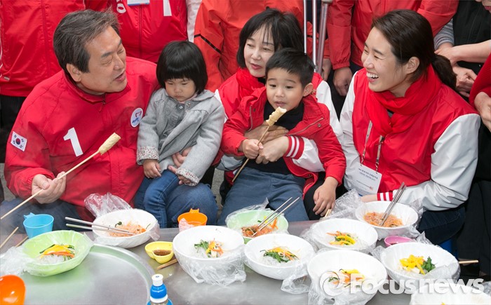 (부산=포커스뉴스) 제20대 총선에서 부산 중구영도에 출마한 김무성(왼쪽) 새누리당 대표가 11일 오후 부산 중구 국제시장 먹자골목 좌판 음식점에 앉아, 부인 최양옥 씨와 손자·손녀를 안고 음식을 먹으며 대화하고 있다. 오른쪽은 첫째딸 김현진 씨.