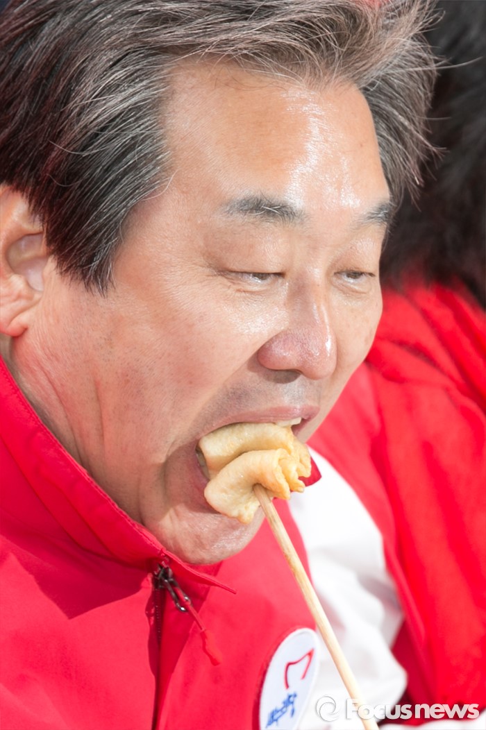 (부산=포커스뉴스) 제20대 총선에서 부산 중구영도에 출마한 김무성 새누리당 대표가 11일 오후 부산 중구 국제시장 먹자골목 좌판 음식점에 앉아, 어묵을 먹고 있다.