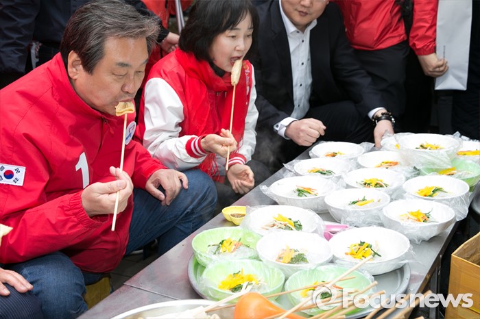 (부산=포커스뉴스) 제20대 총선에서 부산 중구영도에 출마한 김무성(왼쪽) 새누리당 대표가 11일 오후 부산 중구 국제시장 먹자골목 좌판 음식점에 앉아, 부인 최양옥 씨와 음식을 먹고 있다.
