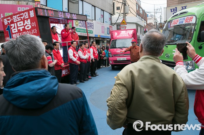 (부산=포커스뉴스) 제20대 총선에서 부산 중구영도에 출마한 김무성 새누리당 대표가 11일 오후 부산 중구 보수동 책방골목 앞에서 유세를 하고 있다.