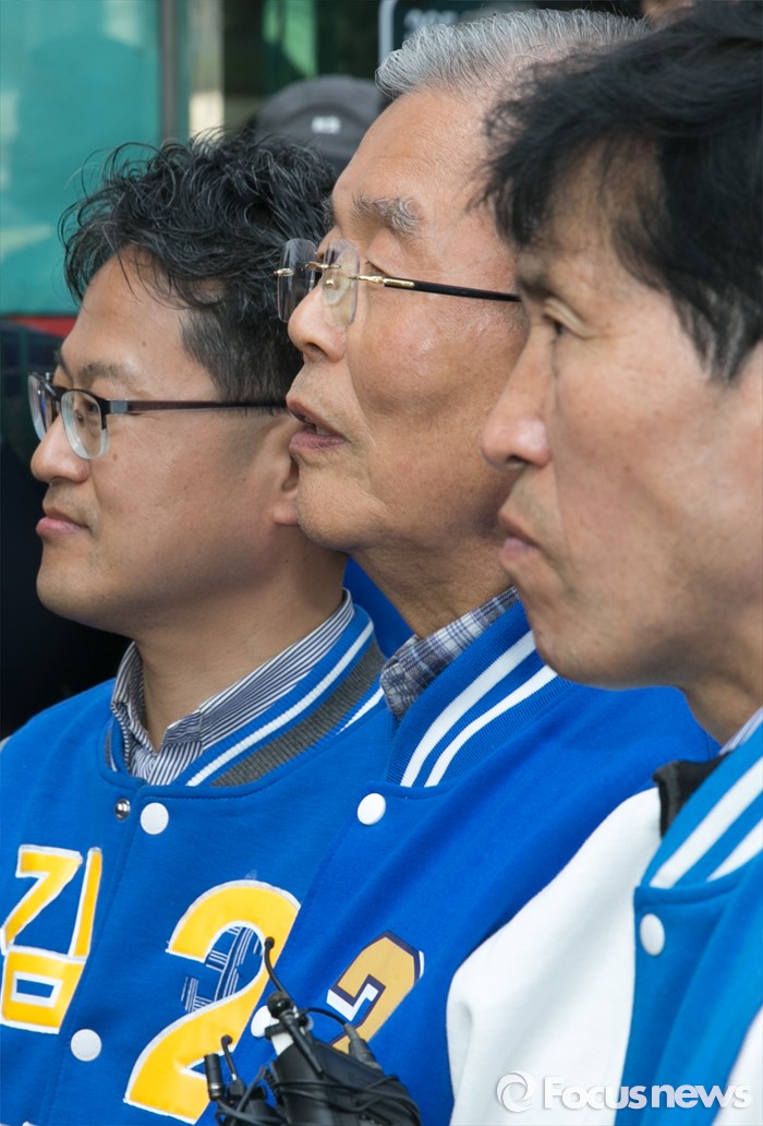 (군포=포커스뉴스) 20대 총선을 이틀 앞둔 11일 오후 경기도 군포 당동우체국 사거리에서 열린 더불어민주당 군포지역 합동유세에 참석한 김종인(가운데) 비대위 대표 겸 선대위원장이 김정우(왼쪽) 군포갑, 이학영 군포을 후보와 함께 취재진 질문에 답하고 있다.