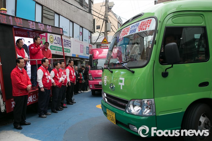 (부산=포커스뉴스) 제20대 총선에서 부산 중구영도에 출마한 김무성 새누리당 대표가 11일 오후 부산 중구 보수동 책방골목 앞에서 유세를 하고 있다.