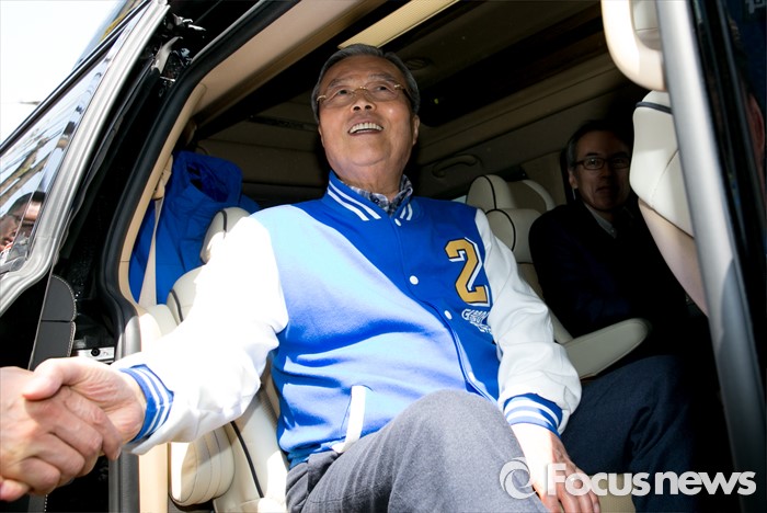 (군포=포커스뉴스) 20대 총선을 이틀 앞둔 11일 오후 경기도 군포 당동우체국 사거리에서 더불어민주당 군포지역 합동유세를 마친 김종인(오른쪽) 비대위 대표 겸 선대위원장이 후보들의 배웅을 받으며 이동하고 있다.