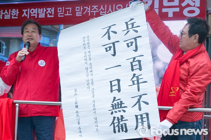 (부산=포커스뉴스) 제20대 총선에서 부산 중구영도에 출마한 김무성 새누리당 대표가 11일 오후 부산 중구 국제시장 앞에서 유세 중, 지지자로부터 족자를 받고 있다.