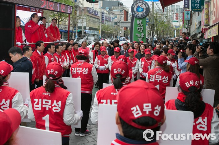 (부산=포커스뉴스) 제20대 총선에서 부산 중구영도에 출마한 김무성 새누리당 대표가 11일 오후 부산 중구 부평동 깡통시장 앞에서 유세를 하고 있다.