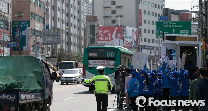 (군포=포커스뉴스) 20대 총선을 이틀 앞둔 11일 오후 경기도 군포 당동우체국 사거리에서 열린 더불어민주당 군포지역 합동유세에 불편을 겪는 차량들을 위해 경찰들이 교통정리를 하고 있다.