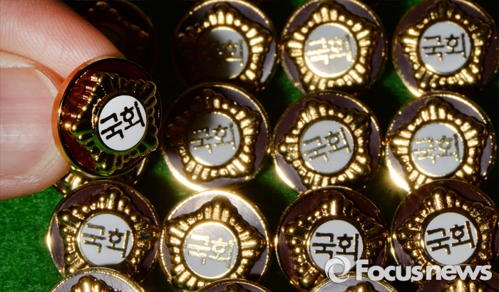 (서울=포커스뉴스) 4.13총선을 이틀 앞둔 11일 오후 서울 여의도 국회에서 20대 국회의원 당선자들이 착용할 배지가 공개되고 있다.