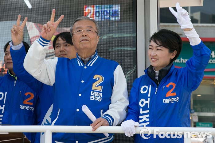 (광명=포커스뉴스) 20대 총선을 이틀 앞둔 11일 오후 경기도 광명 하안사거리에서 김종인(왼쪽) 더불어민주당 비대위 대표 겸 선대위원장과 이언주 광명을 후보가 지지를 호소하고 있다.