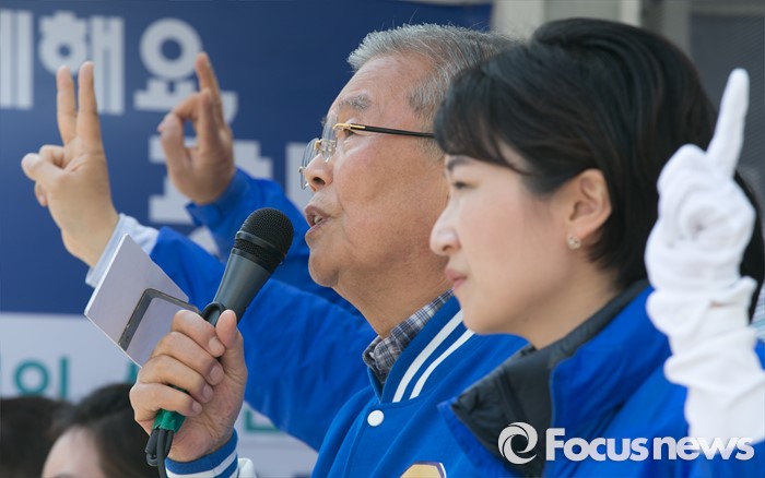 (광명=포커스뉴스) 20대 총선을 이틀 앞둔 11일 오후 경기도 광명 하안사거리에서 김종인 더불어민주당 비대위 대표 겸 선대위원장이 이언주 광명을 후보의 지지를 호소하고 있다.