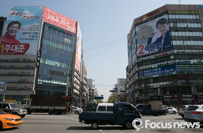 (광명=포커스뉴스) 20대 총선을 이틀 앞둔 11일 오후 경기도 광명 하안사거리에서 광명을에 출마한 주대준 새누리당 후보와 이언주 더불어민주당 후보의 선거사무소 현수막이 보이고 있다.