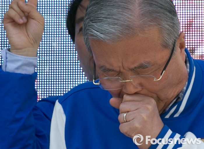 (광명=포커스뉴스) 20대 총선을 이틀 앞둔 11일 오후 경기도 광명 하안사거리에서 김종인 더불어민주당 비대위 대표 겸 선대위원장이 이언주 광명을 후보의 유세를 마친 뒤 기침을 하고 있다.