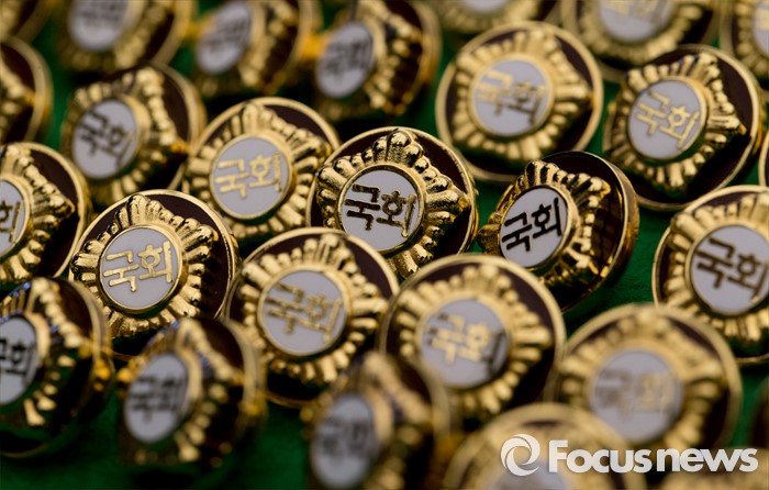 (서울=포커스뉴스) 4.13총선을 이틀 앞둔 11일 오후 서울 여의도 국회에서 20대 국회의원 당선자들이 착용할 배지가 공개되고 있다.