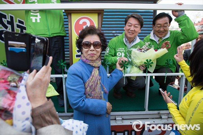 (평택=포커스뉴스) 안철수 국민의당 상임공동대표(오른쪽 두번째)가 11일 오후 안산시 평택역 광장 앞에서 이계안 평택시을 후보와 최인규 평택시갑 후보 지원 유세를 하던 중 지지자들과 기념사진을 찍고 있다.