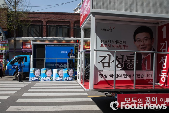 (서울=포커스뉴스) 20대 총선을 이틀 앞둔 11일 오후 서울 마포구 망원시장 일대에서 손혜원 더불어민주당 마포구을 후보의 선거차량 앞으로 김성동 새누리당 후보 선거차량이 지나가고 있다.