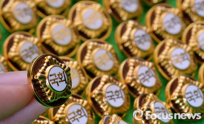 (서울=포커스뉴스) 4.13총선을 이틀 앞둔 11일 오후 서울 여의도 국회에서 20대 국회의원 당선자들이 착용할 배지가 공개되고 있다.