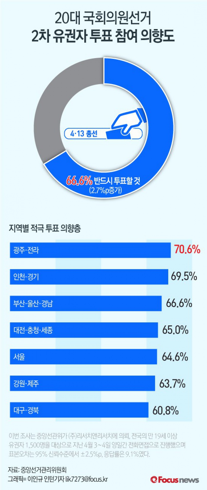(서울=포커스뉴스) 중앙선거관리위원회는 11일 20대 국회의원 선거와 관련한 2차 여론조사 5명 중 3명 이상(66.6%)이 '반드시 투표할 것'이라고 응답했다고 밝혔다. 1차조사보다 2.7%p 높게 나타났다.