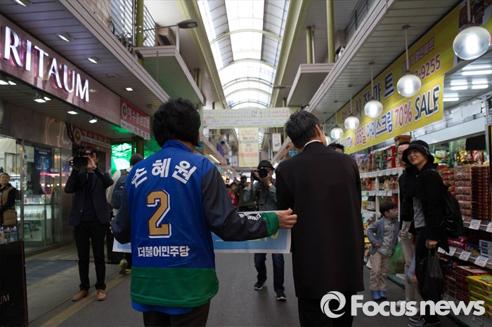 (서울=포커스뉴스) 20대 총선을 이틀 앞둔 11일 오후 서울 마포구 망원시장 일대에서 손혜원 더불어민주당 마포구을 후보가 가수 이은미와 함께 선거유세를 하고 있다.