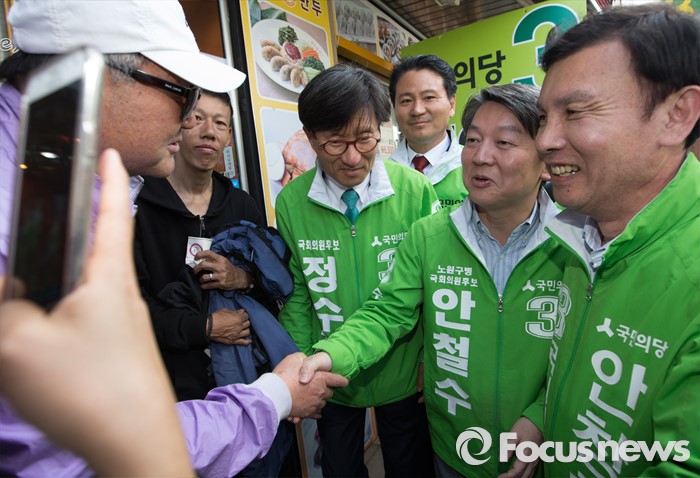 (청주=포커스뉴스) 안철수 국민의당 대표가 11일 오후 충북 청주시 사창사거리에서 20대 국회의원 충북도에 출마한 국민의당 후보의 지지를 호소하며 시민들과 악수를 하고 있다.