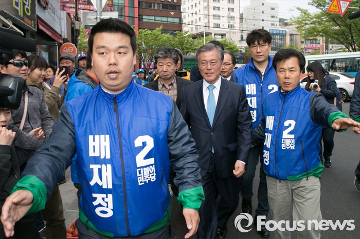 (부산=포커스뉴스) 문재인(오른쪽 두번째) 전 더불어민주당 대표가 11일 오후 부산시 사상구 가야대로 주례럭키아파트 앞에서 배재정 더불어민주당 사상 후보 지원유세를 하고 있다.