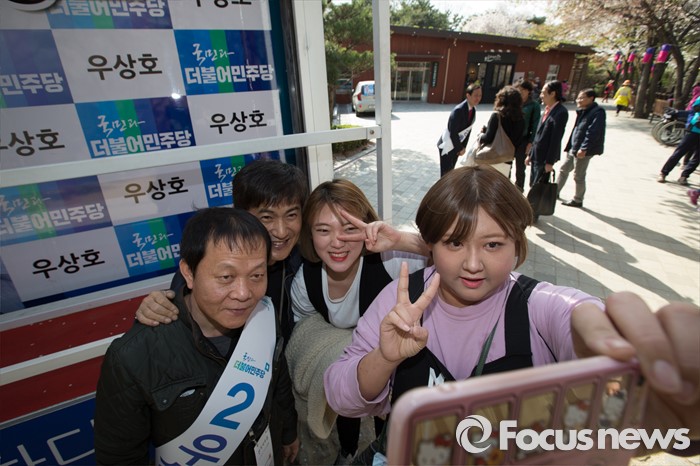 (서울=포커스뉴스) 11일 오후 서울 서대문구 청소년수련관 앞에서 영화배우 안내상, 우현씨가 우상호 더불어민주당 서대문구갑 후보를 지원하기 위해 시민들과 기념촬영을 하고 있다.