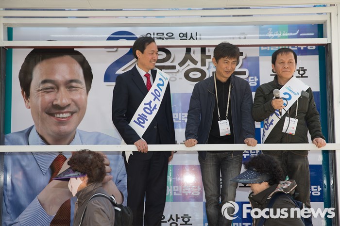 (서울=포커스뉴스) 11일 오후 서울 서대문구 청소년수련관 앞에서 우상호(왼쪽) 더불어민주당 서대문구갑 후보가 영화배우 안내상, 우현과 함께 유세를 하고 있다.