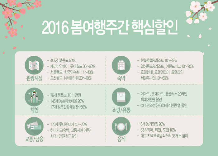 여행에서 가장 많은 비용이 부담되는 숙박 부문에서는 한화호텔앤드리조트와 대명리조트 등 유명 리조트를 비롯해 한국관광공사가 지정·운영하는 중저가 숙박시설인 97개의 굿스테이 등에서 할인이 진행되어 여행객들의 부담을 덜 전망이다.2016 봄여행주간 핵심할인 그래프.<자료제공=문화체육관광부>