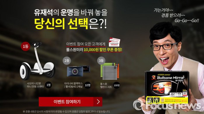 다음달 11일까지 진행되는 이벤트는 불스원미러 공식 홈페이지에서 참여가능하다. 참여자 전원에게는 '불스원미러 1만원 할인쿠폰'을 나눠준다.불스원의 '유재석의 불스원미러 인생극장' 이벤트 <사진제공=불스원>