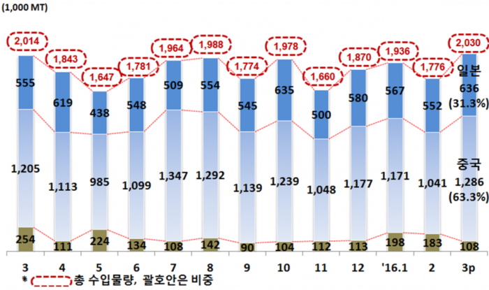 이중 철근은 전년동월대비 123.1% 늘어난 15만톤을 기록했다. 일본산이 43.5% 감소한 6000톤을 나타냈음에도, 중국산 철근 수입량은 14만톤으로 전년동기대비 148.1% 늘었다.