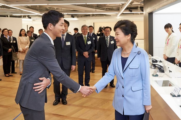 (서울=포커스뉴스) 박근혜 대통령은 11일 오전 서울 중구 한국관광공사 서울센터에서 열린 K-스타일 허브(K-Style Hub) 한식문화관 개소식에서 배우 송중기와 인사하고 있다. <사진출처=청와대>