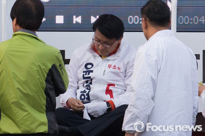 (인천=포커스뉴스) 20대 총선을 이틀 앞둔 11일 오후 인천 남구 제물포역 앞에서 윤상현 무소속 남구을 후보가 유세차량에 앉아있다.
