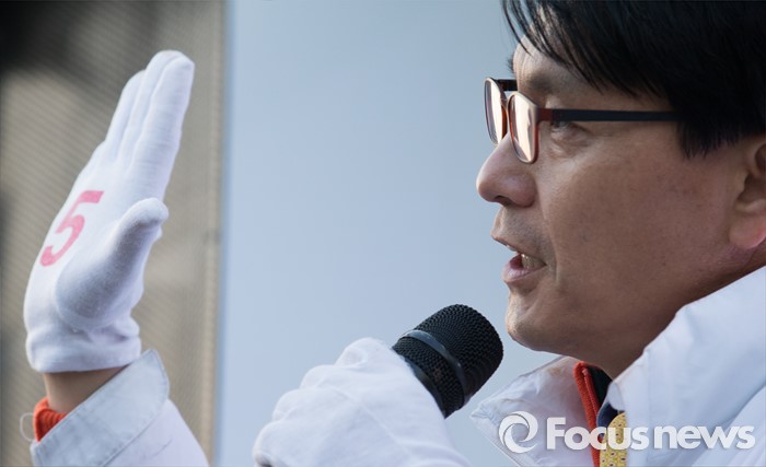 (인천=포커스뉴스) 20대 총선을 이틀 앞둔 11일 오후 인천 남구 제물포역 앞에서 윤상현 무소속 남구을 후보가 유권자에게 지지호소 하고 있다.