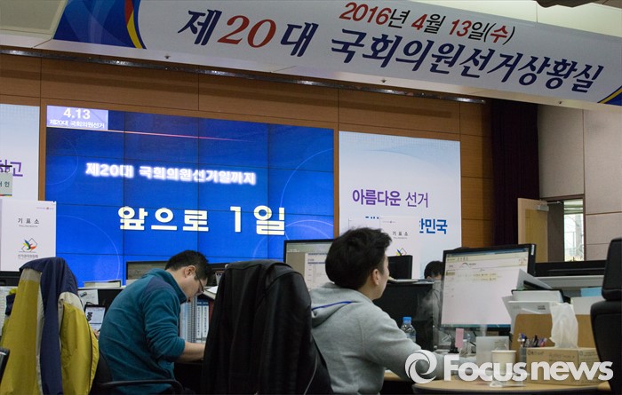 (과천=포커스뉴스) 2016 제20대 국회의원선거를 하루 앞둔 12일 오전 경기도 과천시 중앙선거관리위원회에 설치된 상황실에서 직원들이 업무를 보고 있다.