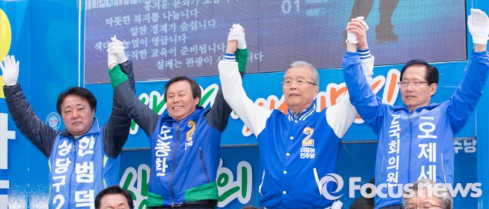(청주=포커스뉴스) 국회의원 선거를 하루 앞둔 12일 오전 충북 청주 상당구 육거리시장 앞에서 김종인 더불어민주당 대표가 청주지역 후보의 지지를 호소하고 있다.