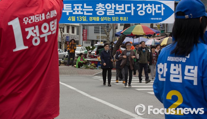 (청주=포커스뉴스) 국회의원 선거를 하루 앞둔 12일 오전 충북 청주 상당구 육거리시장 앞에서 새누리당 정우택 후보, 더불어민주당 한범덕 후보의 선거운동원들이 지지를 호소하고 있다.