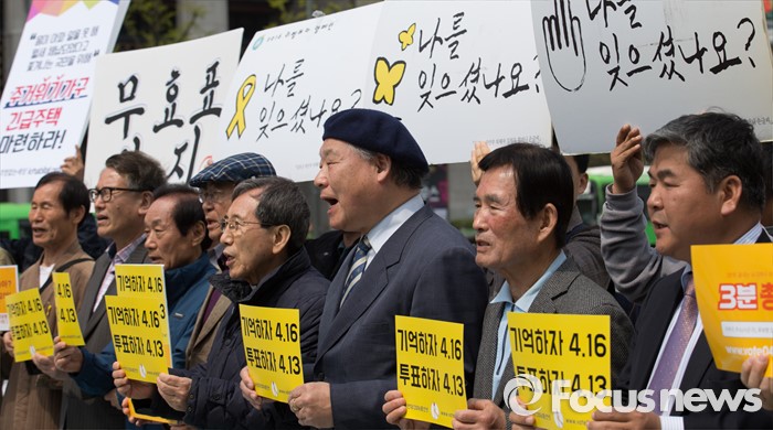 (서울=포커스뉴스) 제20대 국회의원 선거를 하루 앞둔 12일 오전 서울 광화문광장에서 2016 총선시민네트워크 회원들이 총선 투표참여를 호소하는 구호를 외치고 있다.