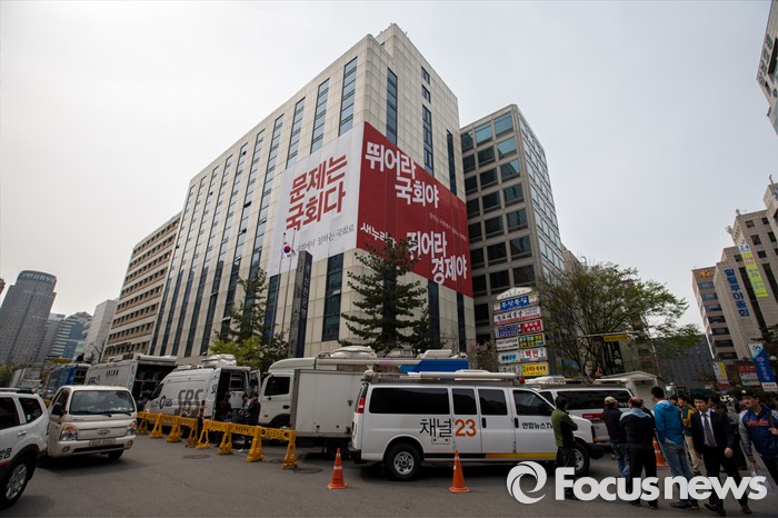 (서울=포커스뉴스) 제20대 국회의원선거를 하루 앞둔 12일 오전 서울 영등포구 새누리당사 앞에 취재진 중계차량이 선거상황을 취재하기 위해 대기 하고 있다.