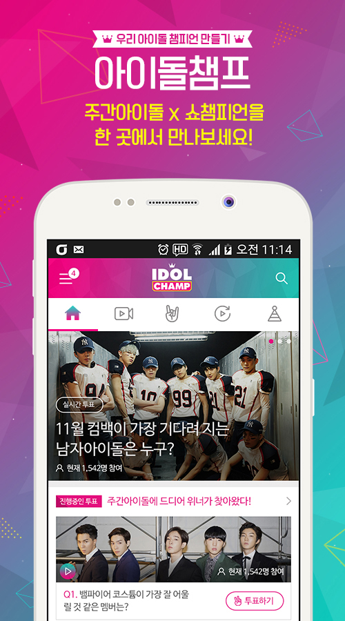 한편 현재 아이돌챔프 앱에서는 서비스 출시를 기념해 쇼챔피언 방청권, 출연자 아이돌의 스페셜 경품 등을 제공하는 다양한 이벤트가 진행되고 있다. 아이돌챔프 앱은 구글플레이 스토어에서 다운로드 받을 수 있으며, 아이폰 이용자를 위한 전용 앱은 올 하반기에 출시될 예정이다.아이돌 챔프 이미지 <사진제공=네오위즈게임즈>