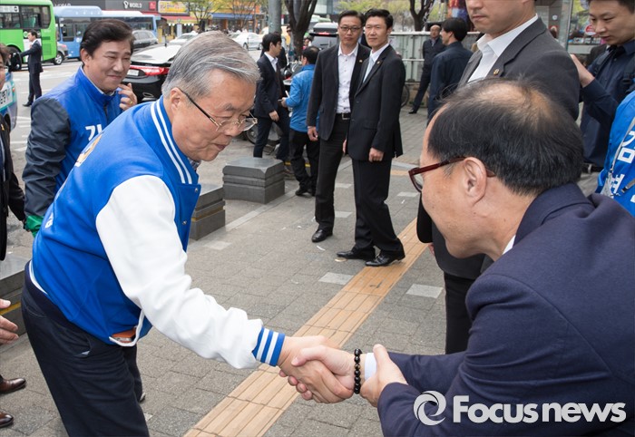 (서울=포커스뉴스) 2016 제20대 국회의원선거를 하루 앞둔 12일 오후 서울 동작구 노량진역 인근에서 김종인 더불어민주당 비대위 대표 겸 선대위원장과 김병기 동작갑 후보가 유권자들에게 지지를 호소하고 있다.