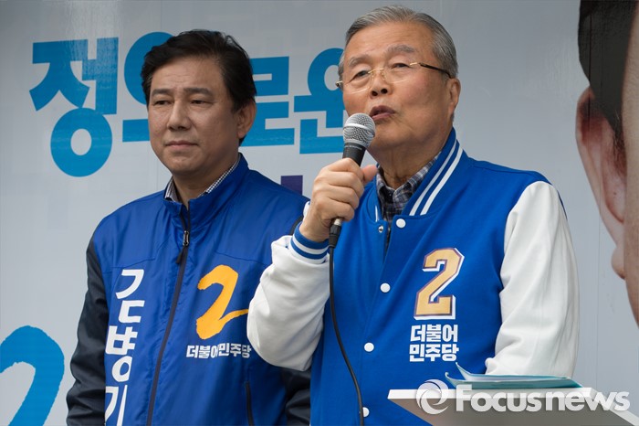 (서울=포커스뉴스) 2016 제20대 국회의원선거를 하루 앞둔 12일 오후 서울 동작구 노량진역 인근에서 김종인 더불어민주당 비대위 대표 겸 선대위원장과 김병기 동작갑 후보가 유권자들에게 지지를 호소하고 있다.