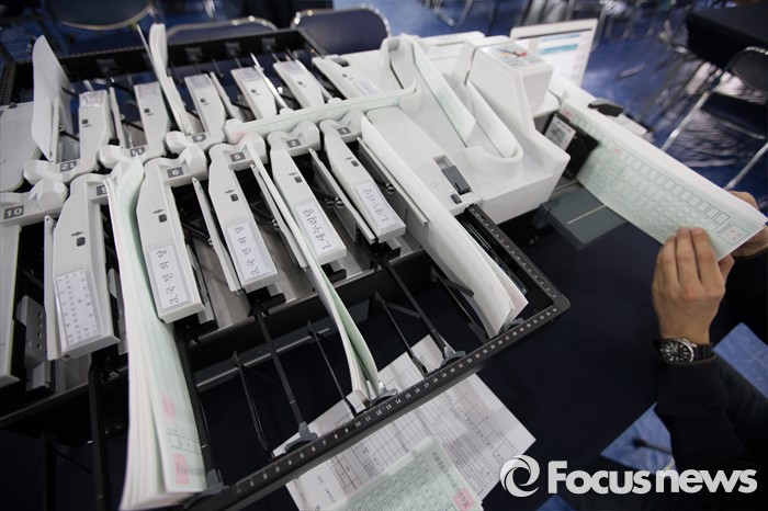 (서울=포커스뉴스) 4.13총선을 하루 앞둔 12일 오후 서울 영등포구 여의도고등학교 체육관에 마련된 개표소에서 선관위 관계자들이 투표지분류기를 점검하고 있다.
