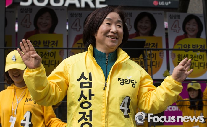 (고양=포커스뉴스) 제20대 국회의원 선거를 하루 앞둔 12일 오후 심상정 정의당 고양갑 후보가 경기 고양시 롯데마트 화정점 앞에서 율동을 선보이고 있다.