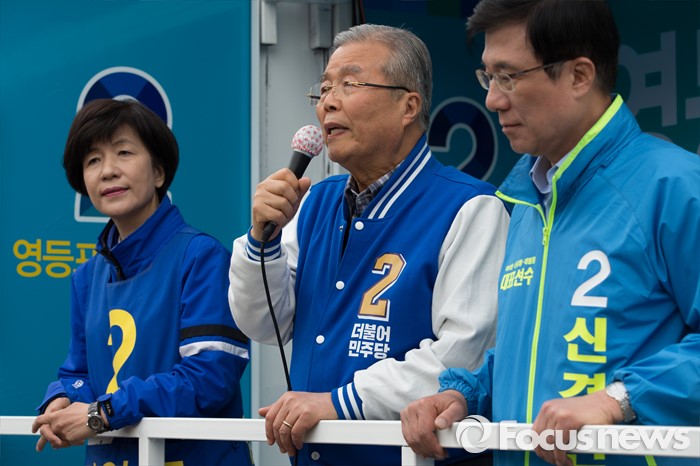 (서울=포커스뉴스) 2016 제20대 국회의원선거를 하루 앞둔 12일 오후 서울 영등포구 신협 도림본점 앞에서 김영주 더불어민주당 영등포갑 후보, 김종인 비대위 대표 겸 선대위원장, 신경민 영등포을 후보가 유권자들에게 지지를 호소하고 있다.