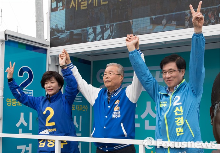 (서울=포커스뉴스) 2016 제20대 국회의원선거를 하루 앞둔 12일 오후 서울 영등포구 신협 도림본점 앞에서 김영주 더불어민주당 영등포갑 후보, 김종인 비대위 대표 겸 선대위원장, 신경민 영등포을 후보가 유권자들에게 지지를 호소하고 있다.