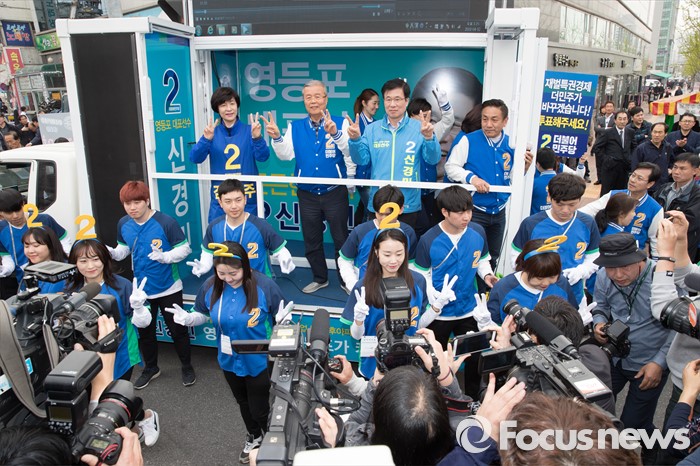 (서울=포커스뉴스) 2016 제20대 국회의원선거를 하루 앞둔 12일 오후 서울 영등포구 신협 도림본점 앞에서 김영주 더불어민주당 영등포갑 후보, 김종인 비대위 대표 겸 선대위원장, 신경민 영등포을 후보가 유권자들에게 지지를 호소하고 있다.