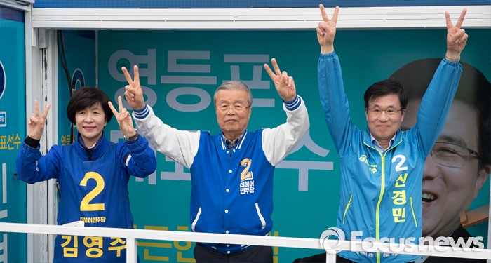 (서울=포커스뉴스) 2016 제20대 국회의원선거를 하루 앞둔 12일 오후 서울 영등포구 신협 도림본점 앞에서 김영주 더불어민주당 영등포갑 후보, 김종인 비대위 대표 겸 선대위원장, 신경민 영등포을 후보가 유권자들에게 지지를 호소하고 있다.