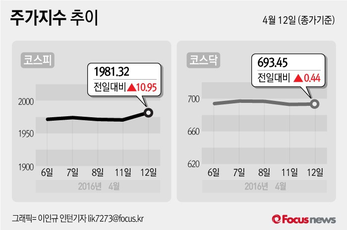 (서울=포커스뉴스) 12일 코스피지수는 전날 보다 0.56%(10.95포인트) 오른1981.32에 장을 마쳤다. 코스닥지수는 전일 대비 0.06%(0.44포인트) 오른 693.45에 마감했다.