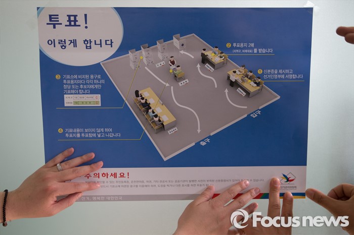 (서울=포커스뉴스) 4.13총선을 하루 앞둔 12일 오후 서울 성북구 보험연수원에 마련된 보문동 제2투표소에서 투표사무원들이 안내판을 설치하고 있다.