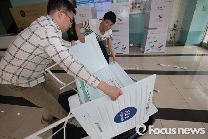 (서울=포커스뉴스) 4.13총선을 하루 앞둔 12일 오후 서울 성북구 보험연수원에 마련된 보문동 제2투표소에서 투표사무원들이 기표소를 설치하고 있다.